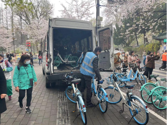 鸡鸣寺路、北京东路、成贤街还有太平北路等几个重点路口是今年樱花季的重点保障路段。哈啰骑行玄武区运营主管唐茂祥向记者介绍,“我们在这些路口都安排了专门的调度车和运维人员。尤其是午后骑行量激增,大量单车涌入,容易造成拥堵,我们需要提前安排、在高峰时段来临时及时响应、及时调度。我们内部还设立了早晚班制度,全天15小时不中断保障,既保证市民、游客有车骑,还要保证单车无淤积。”