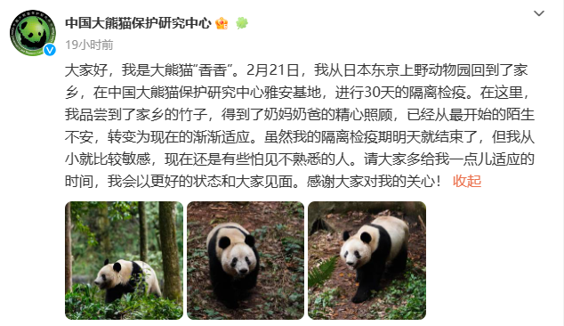荔枝新闻讯 3月21日,@中国大熊猫保护研究中心发文:“大家好,我是大熊猫‘香香’。2月21日,我从日本东京上野动物园回到了家乡,在中国大熊猫保护研究中心雅安基地,进行30天的隔离检疫。在这里,我品尝到了家乡的竹子,得到了奶妈奶爸的精心照顾,已经从最开始的陌生不安,转变为现在的渐渐适应。虽然我的隔离检疫期明天就结束了,但我从小就比较敏感,现在还是有些怕见不熟悉的人。请大家多给我一点儿适应的时间,我会以更好的状态和大家见面。感谢大家对我的关心!”网友:在碧峰峡打滚儿的香香好像变“脏”了一丢丢!