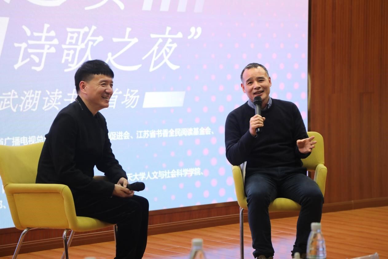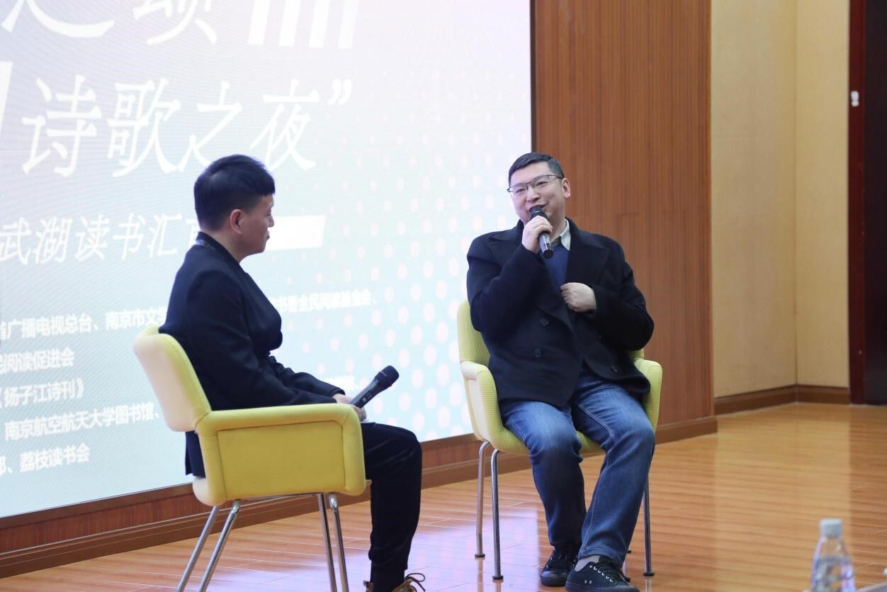 活动通过“荔枝新闻”客户端网络直播,著名诗人、鲁迅文学奖得主韩东,著名诗人、鲁迅文学奖得主、《扬子江诗刊》主编胡弦,著名诗人、南京大学教授、博士生导师傅元峰,著名诗人、小说家、《雨花》副主编育邦与超二十万阅读爱好者及南航学子们一起读诗、品诗、评诗,感受诗歌语言魅力,享受文学精神滋养,线上线下共同度过了一个因阅读而难忘的诗意夜晚。