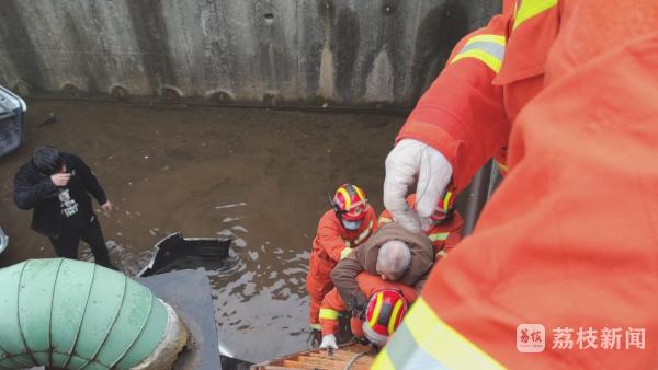 消防员立即展开施救,由于两位老人身体较差,事故发生后也不同程度受伤,经询问无法正常行走,于是消防员们决定将两位老人依次通过梯子背至岸上。于是消防员立即背起老人,让老人紧紧抓住自己,随后消防员一点点顺着梯子向上攀爬,水沟及岸上的消防员从旁辅助,很快两名老人都被安全送至岸上。