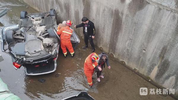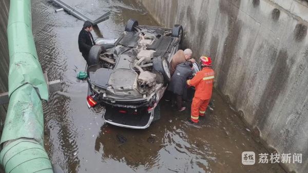 今天(3月22日)上午7点,无锡宜兴市岳东路发生一起交通事故,一辆轿车由于与另一辆车发生碰撞,径直翻进了路边的河沟内,车内三人被困,接到报警后,消防员立即赶往现场。