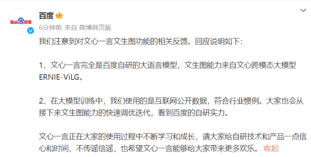 荔枝新闻讯 近日,有多名大V质疑百度文心一言绘图涉嫌套壳,对此@百度 官方微博发布回应称其使用的是互联网公开数据,符合行业惯例。