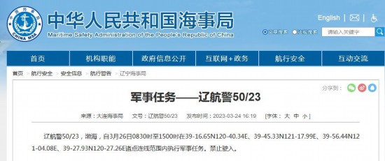 辽航警50/23,渤海,自3月26日0830时至1500时在39-16.65N120-40.34E、39-45.33N121-17.99E、39-56.44N121-04.08E、39-27.93N120-27.26E诸点连线范围内执行军事任务。禁止驶入。