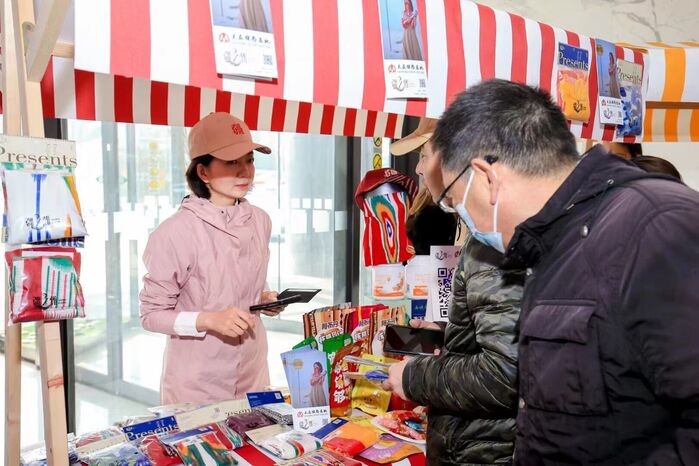 推介会场外,“新疆礼物”主题展备受南京市民欢迎,在推介会开始前,展台围满了观众,他们看着艾德莱斯围巾,欣赏着文创产品“五星出东方”鼠标垫等。大家纷纷表示,新疆这些文创产品有特色,新疆干果又好吃,以后一定要去新疆,感受原汁原味的新疆味道。