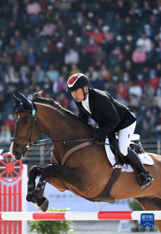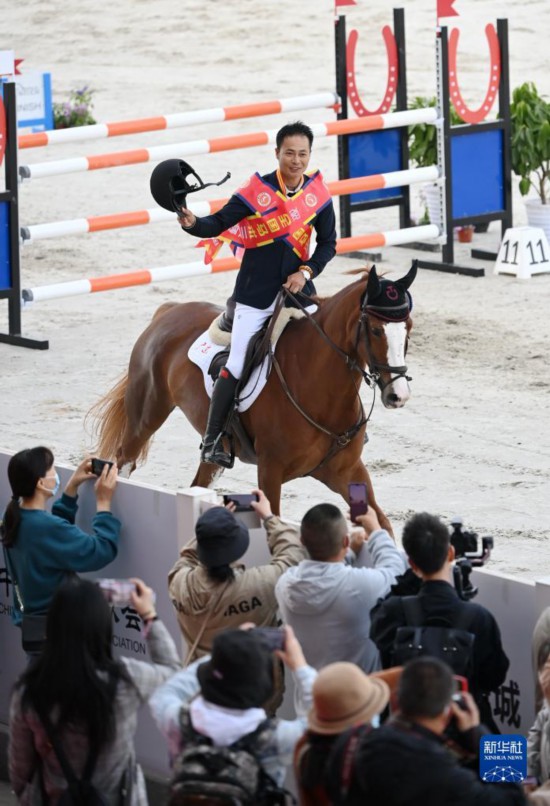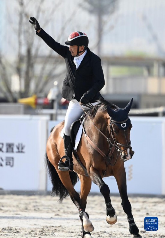3月27日,广东队选手乔仑巴特与赛马恩和在颁奖仪式后绕场致意,乔伦巴特以30.5的总罚分获得三项赛个人赛冠军。新华社记者 李一博 摄