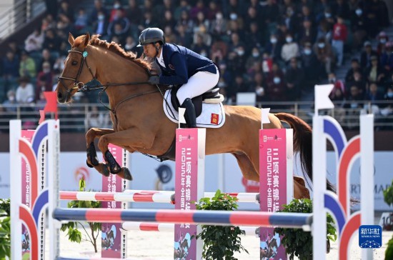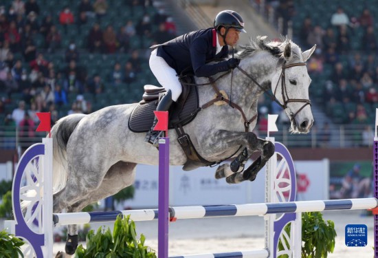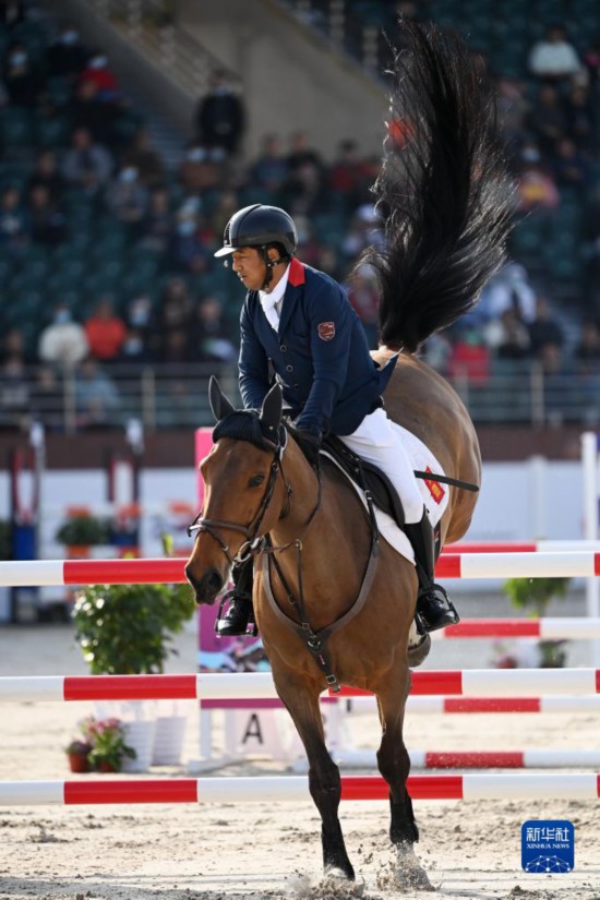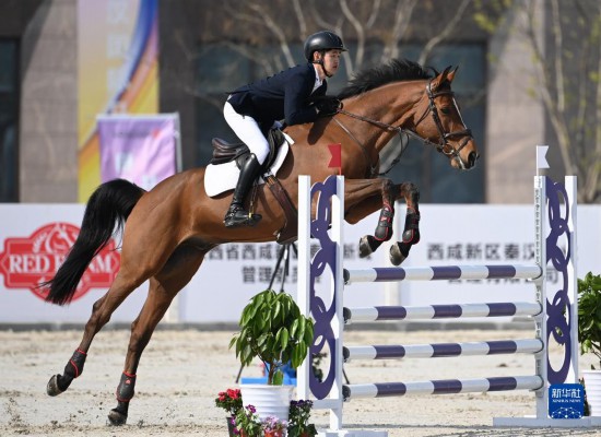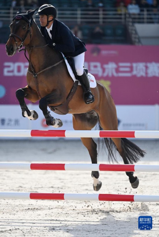 3月27日,广东队选手梁锐基与赛马路易斯在比赛中,梁锐基以32.1的总罚分获得三项赛个人赛亚军。新华社记者 李一博 摄