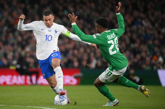 3月27日,法国队球员姆巴佩(左)和爱尔兰队球员奥格本在比赛中拼抢。新华社/法新