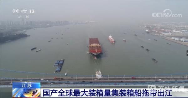 3月28日中午央视《新闻30分》报道了江阴制造的国产全球最大装箱量集装箱船拖带出江。