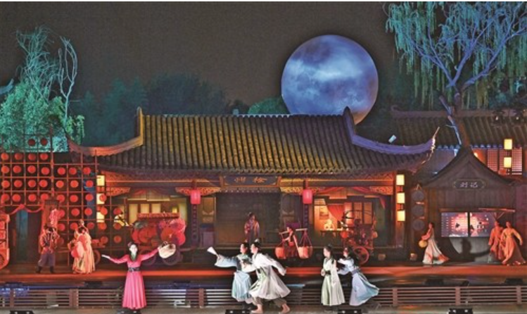 荷风岛前,游船驻停,“苏轼”弃舟上岸,在岛上搭建的彭城巿集场景中,与民同欢,在黄河水灾中守城抗洪。