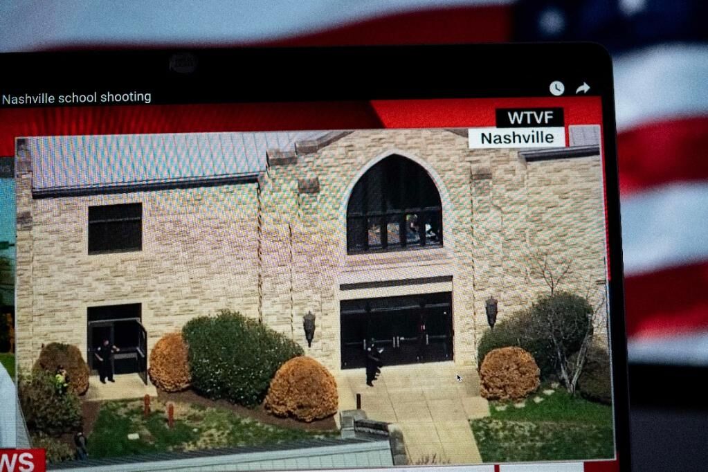 3月27日在美国阿灵顿拍摄的屏幕显示美国田纳西州一小学发生枪击事件的现场画面。田纳西州纳什维尔市一小学27日发生枪击事件,造成包括3名儿童在内的6人遇害,枪手被警察击毙。新华社记者刘杰摄