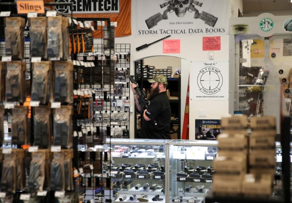 图为2017年10月4日拍摄的照片,在美国拉斯维加斯的“新前线”枪械商店,一名店员为顾客展示枪支。新华社记者 王迎 摄
