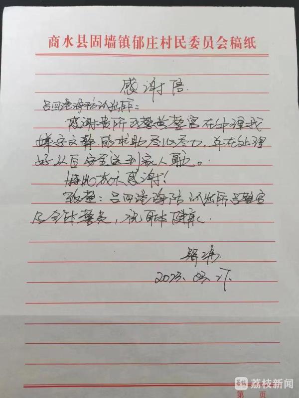 深夜的陪伴感动了安某的家人,他们对民警尽心尽力处理安某求助的事情深表感谢,对民警恪尽职守柔性执法的态度表示赞赏,于3月27日写下感谢信一封,从千里迢迢的河南加急寄到了吕四港海防派出所。