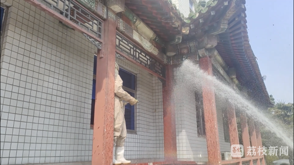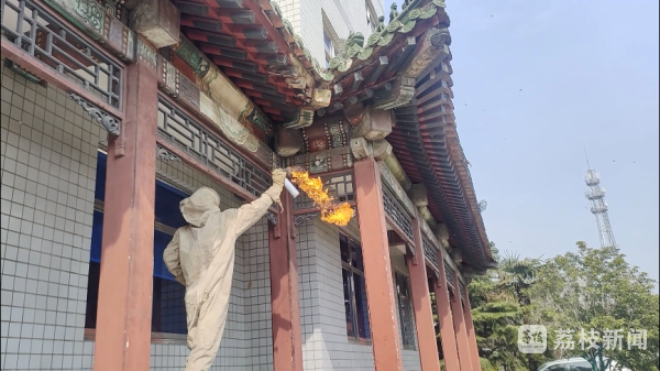 同样在3月28日,泰州市兴化市戴南镇人民政府大楼,屋檐下有马蜂窝。经勘查,现场为屋檐下有马蜂窝。指挥员下令立即用杀虫剂喷火灭马蜂。蜂窝处置接近尾声时,消防员出水将剩余蜂窝浇灭。