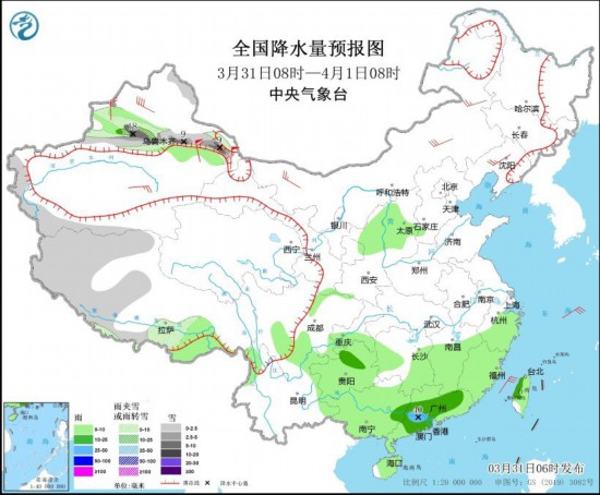 3月31日08时至4月1日08时,新疆沿天山地区和伊犁河谷、西藏西部和南部等地部分地区有小到中雪或雨夹雪,局地有大雪或暴雪(10~18毫米)。陕西北部、山西中西部、江南大部、西南地区东部、华南、台湾岛等地部分地区有小到中雨,其中,广东中部等地部分地区有大雨(25~40毫米)。新疆、内蒙古、东北地区等地部分地区有4~6级风,其中,新疆山口地区阵风风力可达12级左右(见图1)。东海北部海域将有5~7级风,阵风8级。