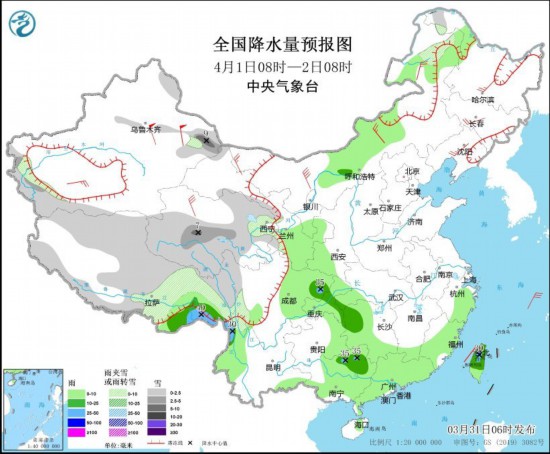 图1 全国降水量预报图(3月31日08时-4月1日08时)