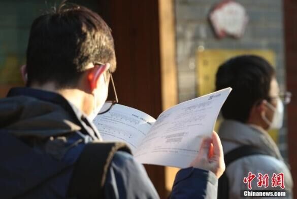 资料图:1月8日,江西南昌市第二十八中学考点外,一名考生拿着资料在复习。中新社记者 刘力鑫 摄