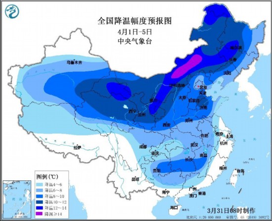 大风降温预报:4月1日至5日,受较强冷空气影响,北方大部地区气温下降6~10℃,内蒙古等地部分地区降温幅度可达12℃以上,南方地区气温下降4~8℃,降温10℃以上的国土面积达94万平方公里;中东部地区将有4~6级风,阵风7~9级;1日至2日冷空气主要影响西北地区和内蒙古,3日主要影响东北地区、华北、黄淮和江汉等地,4日至5日影响江淮及以南地区。新疆南部和东部、内蒙古中西部、甘肃、宁夏等地有扬沙或浮尘天气,其中新疆东部和南部、内蒙古西部、甘肃河西等地局部有沙尘暴。3日夜间至5日白天,我国东部海区将出现6~8级风、阵风9~10级。