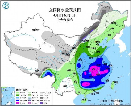 雨雪预报:4月1日夜间至5日,甘肃东部、宁夏、河北北部和内蒙古中东部等地有中到大雪或雨夹雪,内蒙古中部等地局地暴雪或大暴雪,主要降雪时段为2日至3日;西北地区东南部、西南地区东部、江汉、江淮、江南、华南以及黄淮等地有中到大雨,其中河南东南部、湖北东部、湖南、安徽、江西、浙江西部、广西北部、广东北部和福建西部等地的部分地区有暴雨,局地大暴雨;主要降水时段为2日至4日。上述地区累计降水量20~50毫米,部分地区有70~120毫米,局地可达160毫米;100毫米以上降雨覆盖面积达23万平方公里。江淮及以南地区伴有短时强降水、雷暴大风或冰雹等强对流天气,最大小时降水量30~60毫米;江南北部、江汉东部、江淮等地伴有10级以上雷暴大风。
