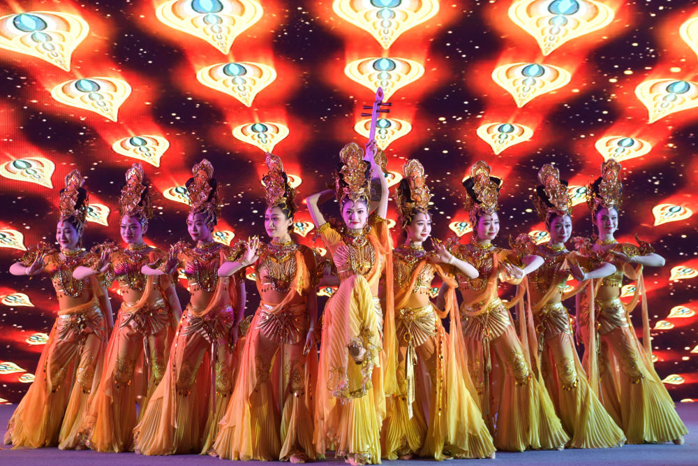 3月31日,在金城兰州遇见金陵南京城际文化交流活动现场,甘肃省话剧院演员表演敦煌舞蹈《金光千佛》。新华社记者 范培珅 摄