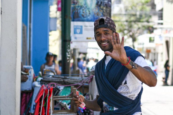 3月26日,一名男子在洪都拉斯首都特古西加尔巴一处街道上面对镜头挥手致意。新华社记者辛悦卫摄