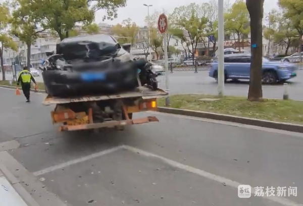 在扬子江中路这家电竞酒店门口,记者看到:六辆车连环相撞,车头车尾各有不同程度受损,四周则散落着汽车零件和碎渣,最后一辆黑色轿车受损最重。