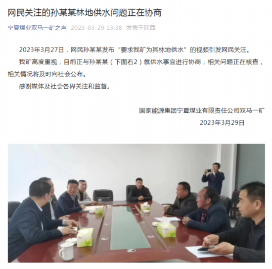 宁夏煤业双马一矿回应“林地供水问题”:目前正与孙某某进行协商