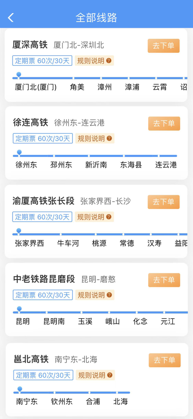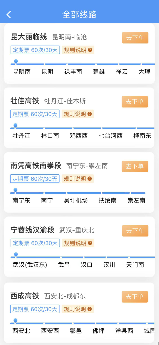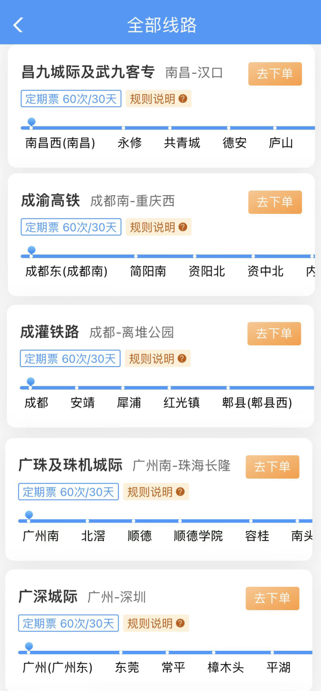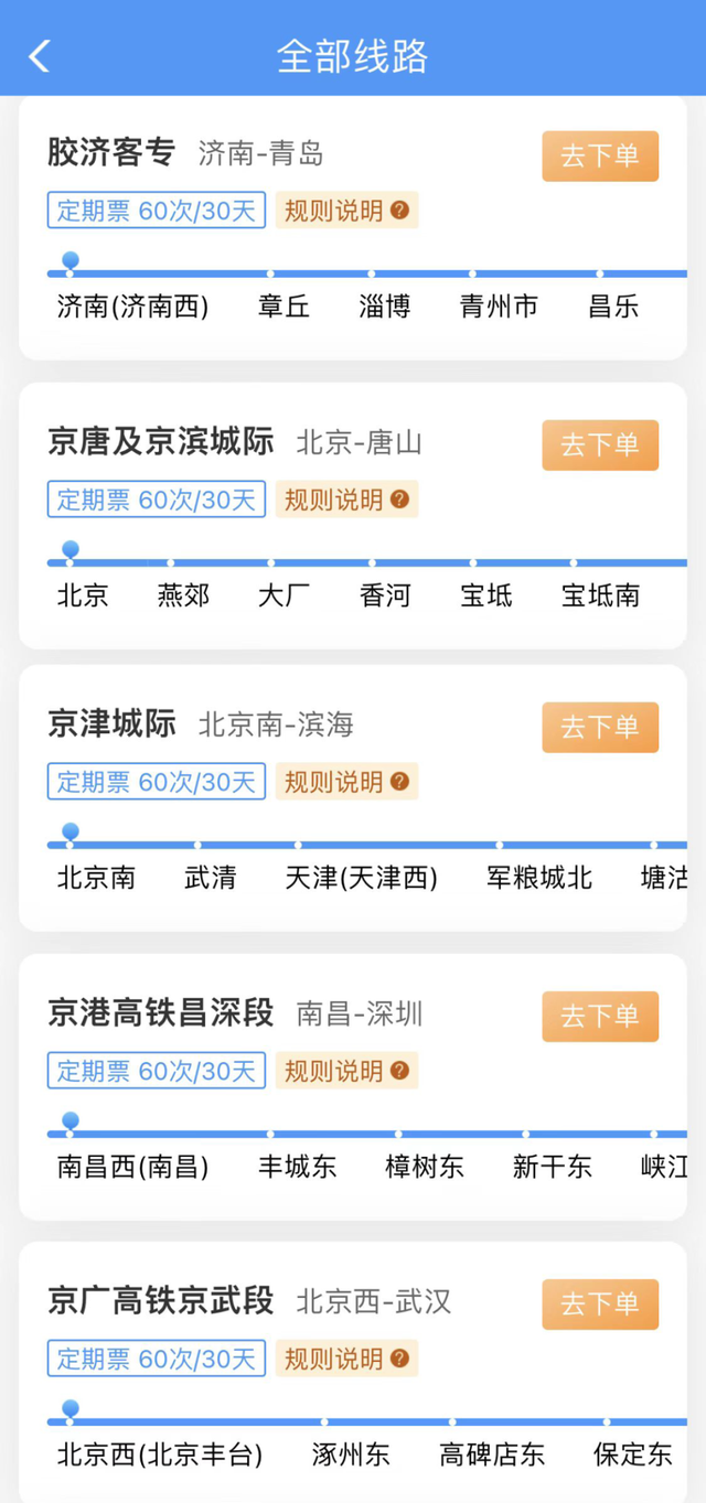 30日定期票:可在30天有效期内,最多乘坐60次在指定线路开行的、购买产品时指定发到站和指定席别的列车。