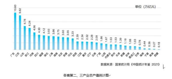据白皮书显示,高等职业教育的就业方向一般以第二产业和第三产业为主,广东省的二、三产业总产值位居第一,其次为江苏、山东和浙江,因此这些省份的产业对职业高校毕业生的吸纳能力较强。