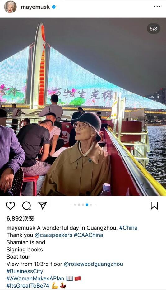 根据Instagram上的信息,梅耶·马斯克开启中国之旅的第一站是在广州。她于3月21日发文说,自己在广州度过了美好的一天,并搭配游览沙面岛,夜游珠江等照片。两天后,她发布了游览厦门南普陀寺的视频,随后更新自己在当地宣传新书的活动照。