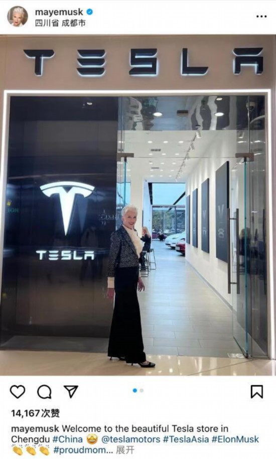 接着,梅耶·马斯克赴成都,参观了成都金沙遗址博物馆,以及观看川剧变脸表演。同时,她还在特斯拉成都门店前留影。