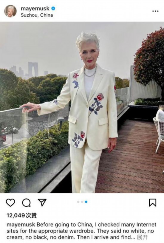 3月27日,梅耶·马斯克贴出自己身穿中国品牌鄂尔多斯西装的照片,她的背后出现了苏州地标东方之门。
