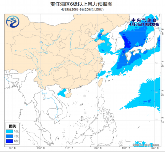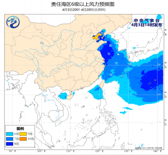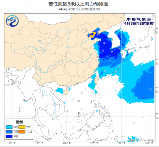 4月3日夜间至5日白天,渤海、渤海海峡将有8~10级、阵风11级的旋转风,黄海中部和南部海域、东海北部海域将有7~8级、阵风9~10级的东南风。为此,中央气象台3日06时继续发布《海上大风预警》。5日夜间至6日白天,渤海、渤海海峡、黄海大部海域将有6~7级、阵风8~9级的北到西北风。
