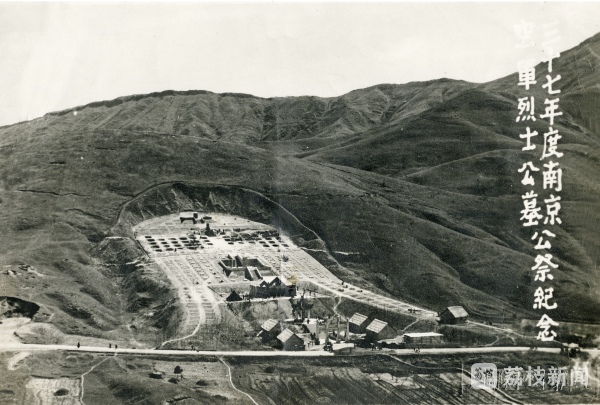 南京抗日航空烈士纪念馆公布了一张摄制于上世纪四十年代的航空烈士公墓航拍照片。从这张照片上,可以清晰地分辨出航空烈士公墓建成初期的布局。公墓整体造型呈警钟形镶嵌在没有什么植被的山坡上,牌坊前方一条土路横贯东西,与现在的宁栖路位置相仿。与公墓现状不同之处在于,牌坊入口左右各有两座耳房,现在的祭堂位置是一座帐篷式构筑物,“帐篷”往上居中有一个不大不小的平台,平台左右和上方整齐排列着百余座阵亡将士的墓穴,蔚为壮观。