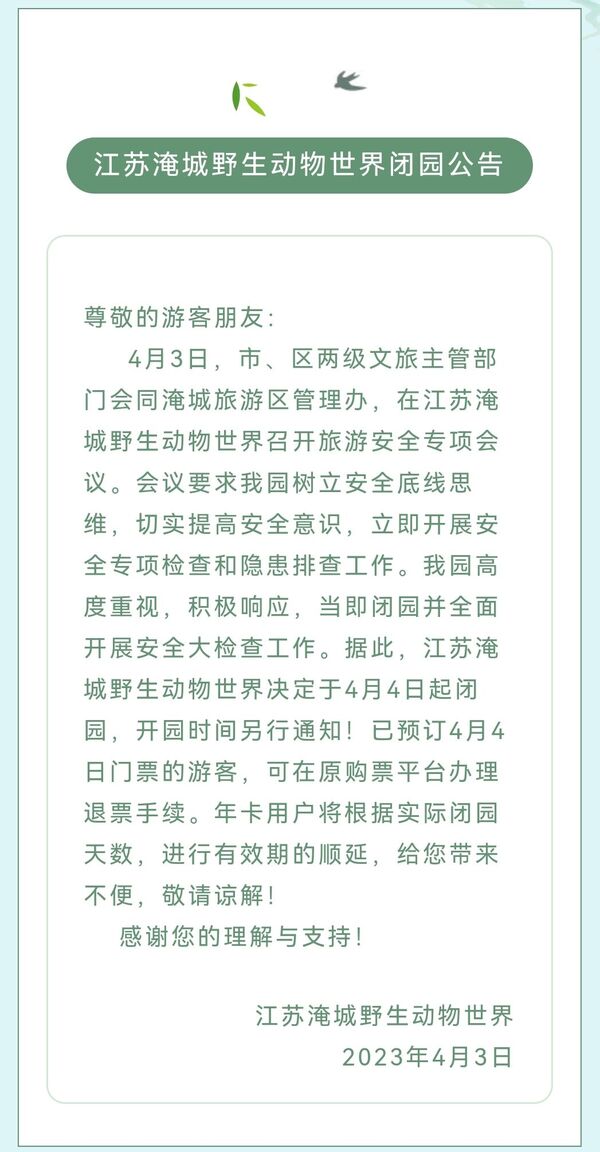 荔枝新闻讯 据“江苏淹城野生动物世界”公众号消息,江苏淹城野生动物世界发布闭园公告。4月3日,市、区两级文旅主管部门会同淹城旅游区管理办,在江苏淹城野生动物世界召开旅游安全专项会议。会议要求树立安全底线思维,切实提高安全意识,立即开展安全专项检查和隐患排查工作。该园高度重视,积极响应,当即闭园并全面开展安全大检查工作。据此,江苏淹城野生动物世界决定于4月4日起闭园,开园时间另行通知。已预订4月4日门票的游客,可在原购票平台办理退票手续。年卡用户将根据实际闭园天数,进行有效期的顺延。