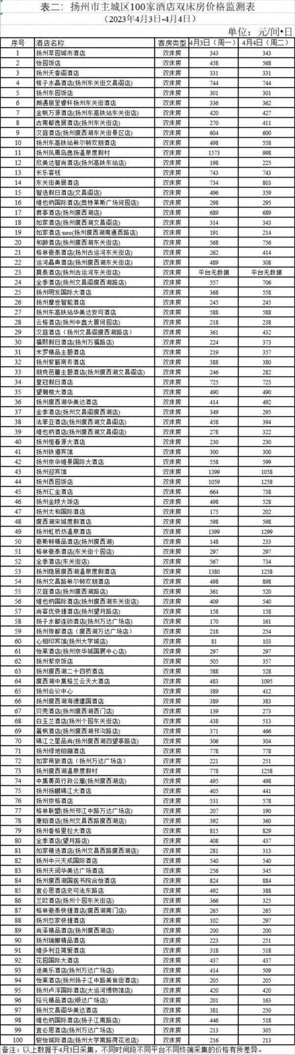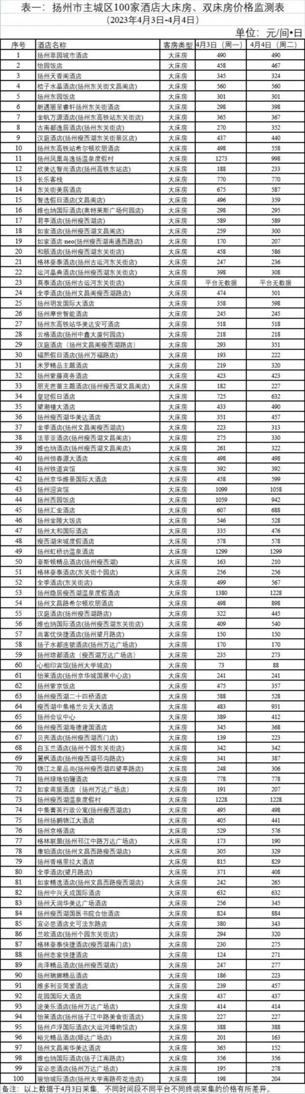 4月3日下午,市发改委公布了扬州市主城区100家酒店大床房、双床房价格监测表(2023年4月3日-4月4日)。具体如下: