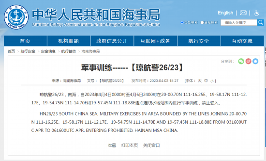 琼航警26/23,南海,自2023年4月4日0000时至4月6日2400时在20-00.70N 111-16.25E、19-58.17N 111-12.17E、19-54.75N 111-14.70E和19-57.45N 111-18.88E诸点连线水域范围内进行军事训练,禁止驶入。