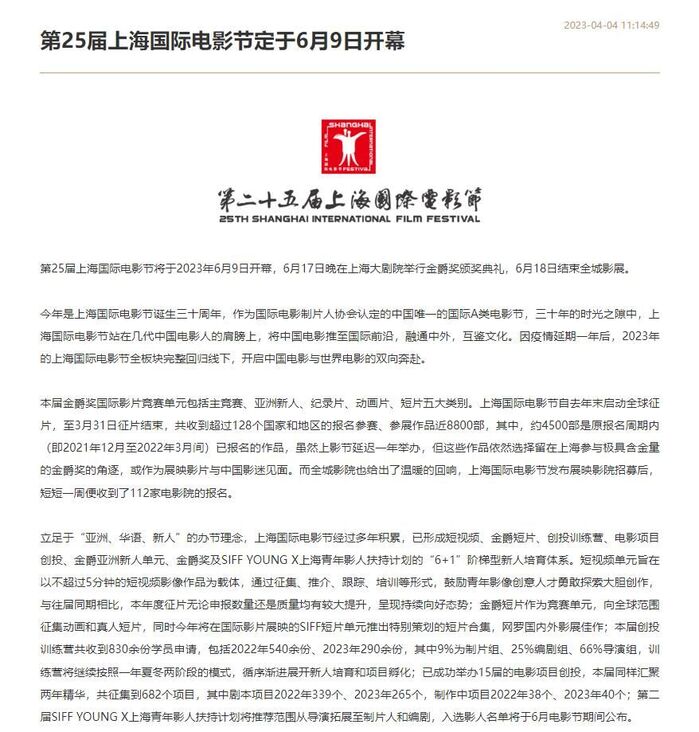 荔枝新闻讯 据上海国际电影节官网消息,第25届上海国际电影节将于2023年6月9日开幕,6月17日晚在上海大剧院举行金爵奖颁奖典礼,6月18日结束全城影展。