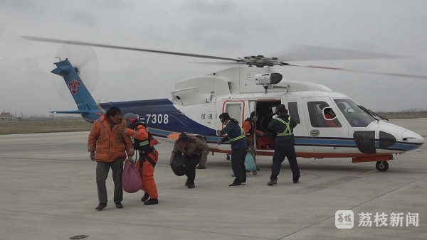 接到急救指令,B-7308驻盐城急救机组立即启动应急救援预案,迅速进场做好起飞的各项准备工作,仅用一个小时就飞抵遇险船舶的上空,机组人员采取绞车作业的方式,避开渔船上的危险障碍物,成功将两艘渔船上的七名渔民吊运上直升机,随后安全送到射阳通用机场着陆。