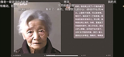 “奶奶”一口方言,跟孙子抱怨:“嗯,你爸回来,我就把他那个搞清楚,也不和他吵,现在懒得吵。”孙子问“奶奶”过年的东西买了吗,“奶奶”回答:“买了两壶油,乡下私榨的,很香啊。”说到这里,“奶奶”开心地笑起来。孙子又说:“奶奶,我在网上买了个铁砂壶,里面放了你最喜爱的茶叶,倒入开水后,放在火炉上煲着,这样就不会冷掉了,大年三十守夜的时候,我们一家人围坐在火炉旁边,聊聊天,喝喝茶。”随着两人之间的家常对话进行下去,视频里一条条“泪目了”“眼泪哗哗下”的弹幕飘过。许多网友表示,今年清明就要用这种方式和去世的亲人对话,寄托哀思。