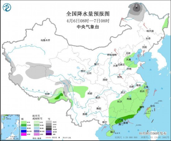图1 全国降水量预报图(4月5日08时-6日08时)
