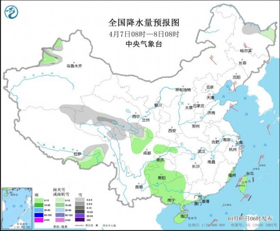 4月7日08时至8日08时,黑龙江北部、新疆伊犁河谷和沿天山地区、西藏北部和东南部、青海中南部、甘肃东部、川西高原北部等地部分地区有小到中雪或雨夹雪,其中,新疆沿天山地区局地有大雪;新疆伊犁河谷、西藏东南部、四川北部、贵州大部、云南东部、广西大部、广东南部沿海地区、海南岛等地部分地区有小雨。内蒙古中东部、东北地区、山东半岛、浙江东部沿海等地部分地区有4~6级风(见图3)。黄海北部和中部海域将有5~7级、阵风8级的偏北风,台湾海峡将有6~7级、阵风8级的东北风。