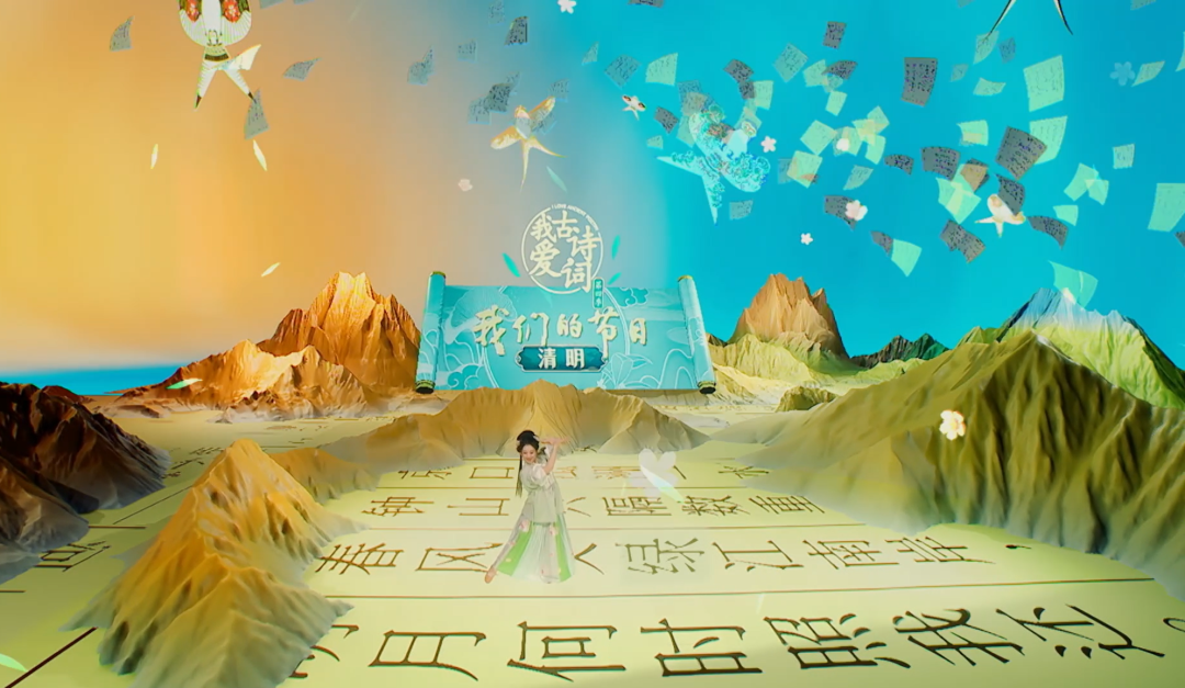 通过技术赋能,让传统文化活起来、火起来。“文化+艺术+科技”一直是《我爱古诗词》的特色看点。本期特别节目运用多项前沿科技,用心打造多维空间,通过全新的舞美设计,完美融入清明元素,营造沉浸式、全视角、大片化的感官体验。XR虚拟技术赋予了民俗舞蹈更为灵动的气质,穿梭机带领观众从场外“飞”临其境,自由视角让时空瞬间定格,AR特效让平行时空的人们来一次跨越千年的对话。有意义的节目,通过特效加持变得更有意思!