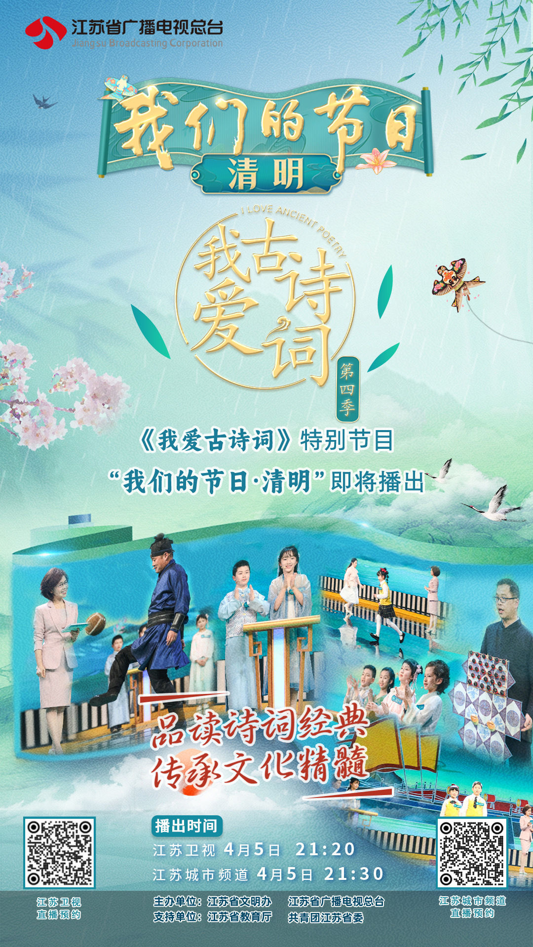 由江苏省文明办、江苏省广播电视总台联合主办,江苏省教育厅、共青团江苏省委支持的《我爱古诗词》特别节目“我们的节日·清明”将于今晚21:20精彩亮相,邀请全省青少年朋友和家长们一起过一个不一样的“清明”。