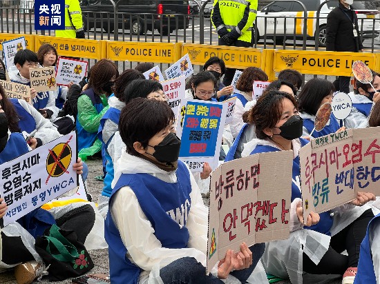 当地时间4月6日中午,韩国市民团体代表来到位于首尔市龙山区的总统府前举行抗议集会,呼吁禁止日本福岛核电站核污染水排入大海。