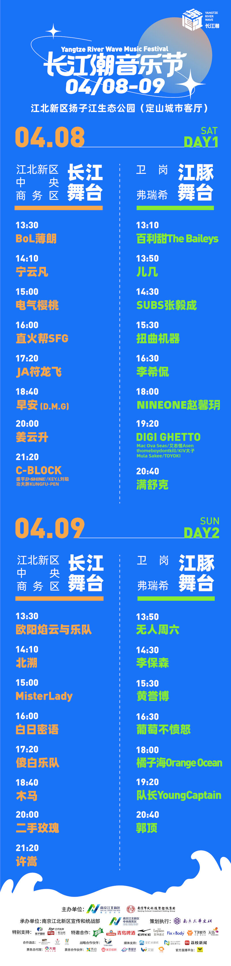 “长江潮音乐节”创新设置了长江舞台和江豚舞台“平行双舞台”。舞台设计将长江浪潮、“微笑天使”江豚与潮流音乐元素相融合,一边是长江浪涛声声入耳,一边是狂欢音浪澎湃袭来。演出阵容中既有像许嵩、郭顶这样兼具强大号召力的实力唱作人代表,又有像黄誉博、李保森这样冉冉上升的南京本土乐坛新秀,涵盖民谣、说唱、摇滚、流行等众多音乐门类,与乐迷共度美好周末。