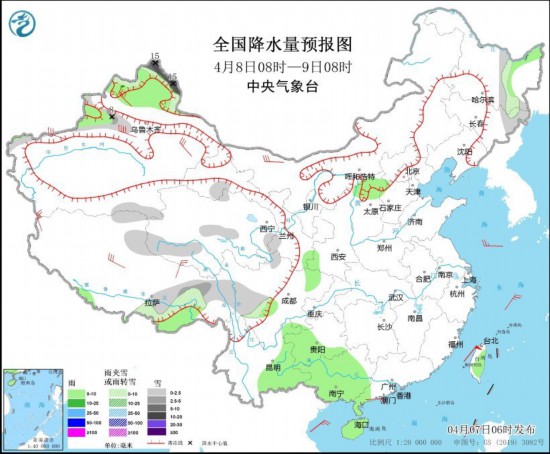 4月8日08时至9日08时,黑龙江东部、吉林东部、新疆北疆北部、西藏北部和东部、青海南部和西部、甘肃河西、川西高原等地部分地区有小到中雪或雨夹雪,其中,新疆北疆北部等地部分地区有大雪,局地暴雪(10~15毫米)。黑龙江东北部、新疆北部、西藏南部、山西北部、四川盆地北部、云南东部、贵州南部、广西西部、海南岛、台湾岛等地部分地区有小到中雨。内蒙古西北部、新疆东部、西藏北部等地部分地区有4~6级风,其中,新疆沿天山地区部分地区有6~7级风(见图2)。
