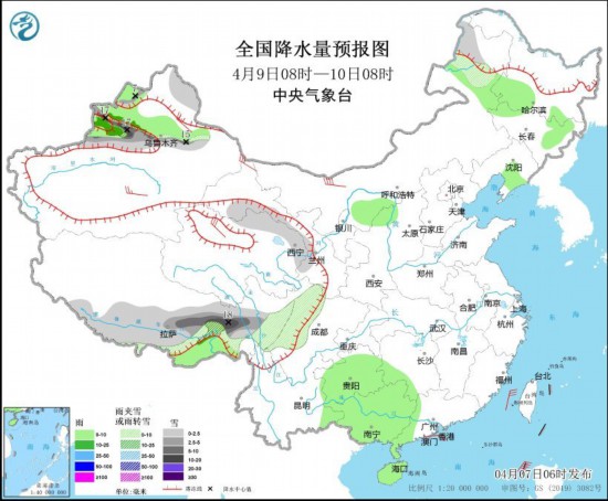 4月9日08时至10日08时,内蒙古东北部、新疆沿天山地区和伊犁河谷、西藏南部和东部、青海北部、川西高原北部等地部分地区有小到中雪或雨夹雪,其中,新疆伊犁河谷、西藏中东部等地部分地区有大到暴雪(10~18毫米)。内蒙古东北部、黑龙江西南部、吉林东部、辽宁东部、新疆沿天山地区和伊犁河谷、西藏东南部、贵州、广西、海南岛等地部分地区有小到中雨。新疆沿天山地区和南疆盆地、青海北部、甘肃河西等地部分地区有4~6级风,其中,内蒙古西北部部分地区有6~7级风(见图3)。