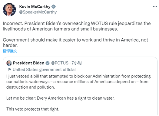 拜登的推文很快引来关注。众议院议长麦卡锡对此表示了不满,“这不对,拜登总统有关对美国水域实施的过度管理规则危及美国农民和小企业的生计。政府应该让(人们)在美国的工作和发展变得更容易,而不是更困难。”