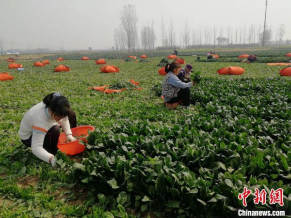 图为工人正在采收菠菜。 定陶融媒体中心供图