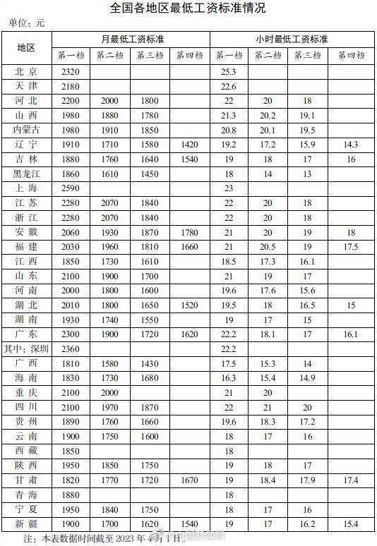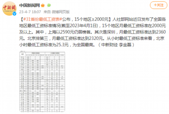 人社部网站近日发布了全国各地区最低工资标准情况(截至2023年4月1日),15个地区月最低工资标准在2000元及以上。其中,上海以2590元仍居榜首。其次是深圳,月最低工资标准达到2360元。北京排第三,月最低工资标准达到2320元。从小时最低工资标准来看,北京小时最低工资标准为25.3元,为全国最高。(中新财经 李金磊)